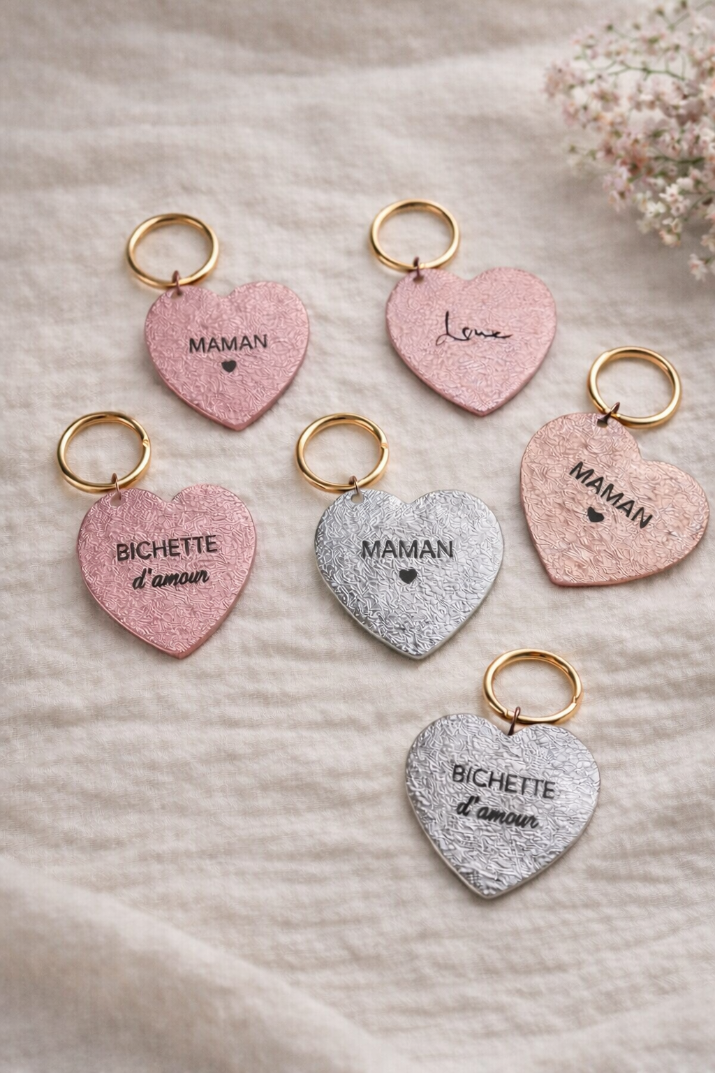 Craquez pour notre collection de porte-clés cœur gravés “Maman”, “Bichette d’amour” et “Love”. Disponibles en rose, rose gold et argenté, ces porte-clés élégants sont le cadeau parfait pour une maman ou une personne chère. Un accessoire doux, féminin et symbolique à offrir pour la fête des mères, un anniversaire ou simplement pour faire plaisir.