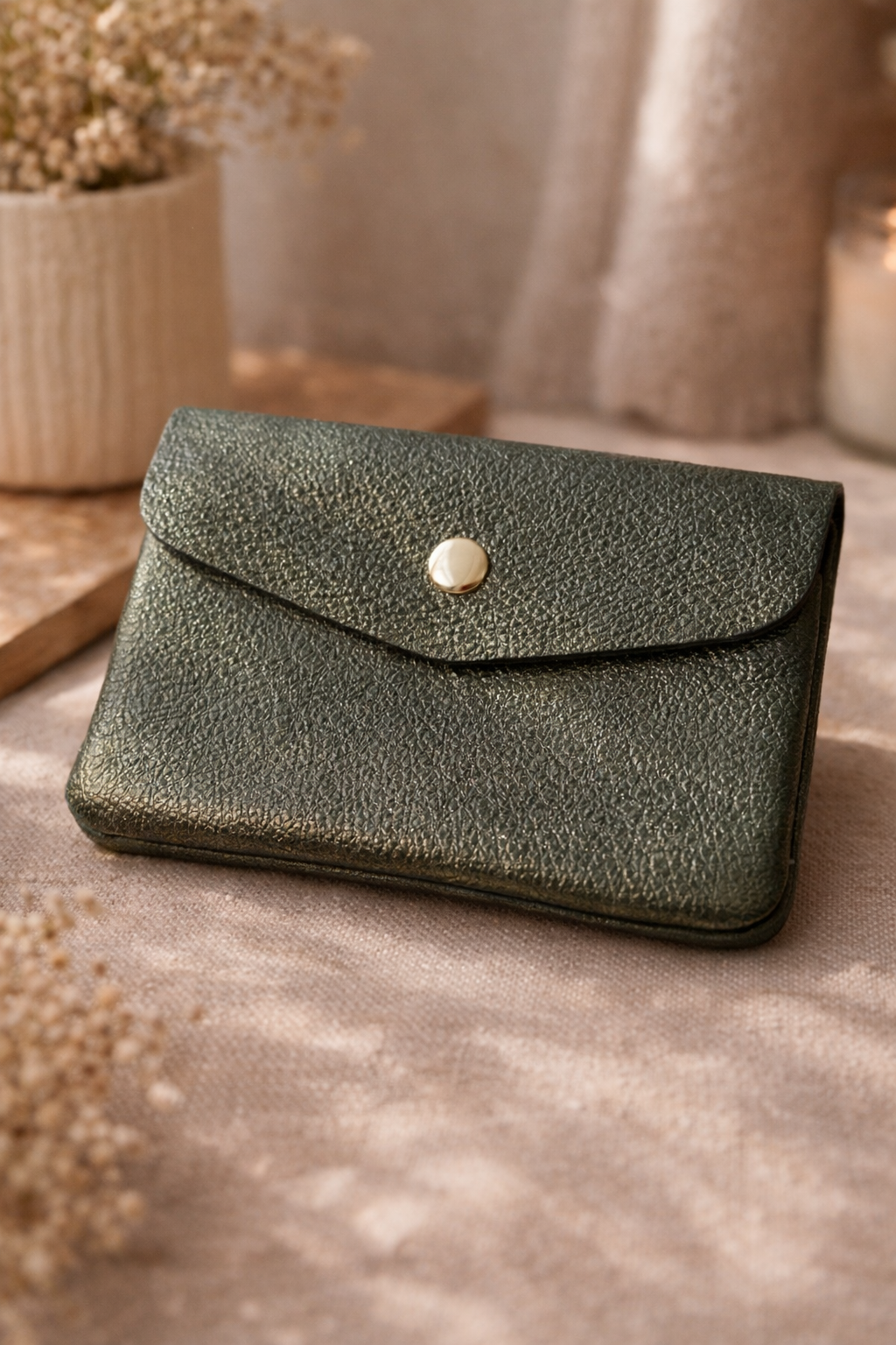 Pratique et élégant, ce porte-monnaie vert est parfait pour ranger monnaie et cartes Son format compact se glisse facilement dans un sac tout en apportant une touche chic et minimaliste.